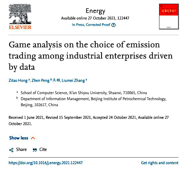 計算機(jī)學(xué)院電子信息(計算機(jī)技術(shù))專業(yè)碩士研究生洪子濤同學(xué)、導(dǎo)師張留美副教授和北京石油化工學(xué)院彭珍教授共同合作撰寫的論文《Game analysis on the choice of emission trading among industrial enterprises driven by data》,日前收到國際SCI期刊《Energy》的論文錄用接收函,并已完成對該論文樣稿的校對,在該期刊網(wǎng)上上線。據(jù)悉,《Energy》是由英國佩加蒙愛思唯爾科學(xué)有限公司出版,是能源動力領(lǐng)域國際Top期刊,目前影響因子7.147。在中國科學(xué)院文獻(xiàn)情報中心期刊分區(qū)表中(2020年12月最新升級版),屬于一區(qū)刊物。