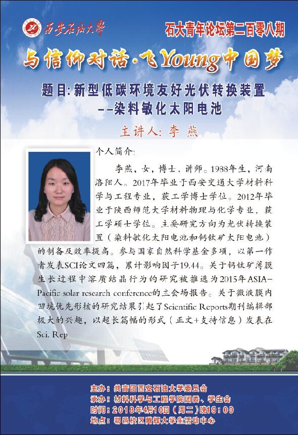 石大青年論壇第208期之:新型低碳環(huán)境友好光伏轉(zhuǎn)換裝置——染料敏化太陽(yáng)電池